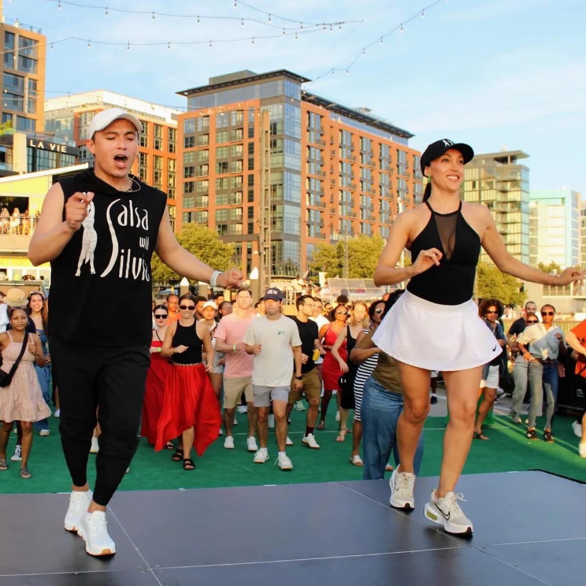 For the dance class all the teams will be together. Then, the teacher starts with a short warm up for the class. After that they break down some easy and super fun steps. The class will be focused on couples’ dance. At the end the teacher puts together all of these steps making a super fun & easy to lead/follow dance.